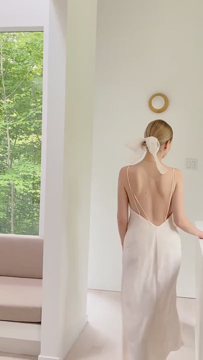 This modern slip dress is crafted from delicate silk crepe, it's beautifully light and exudes chic sophistication. The bias cut gives the fabric a natural stretch, allowing it to slip on effortlessly and move with you. Designed to pair perfectly with all our bridal dresses.