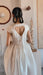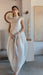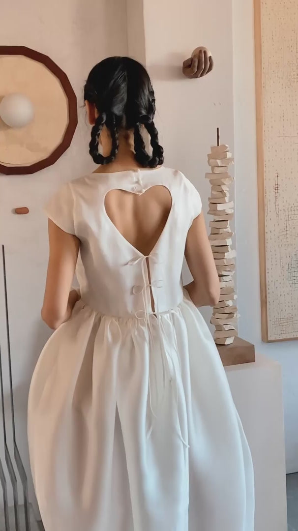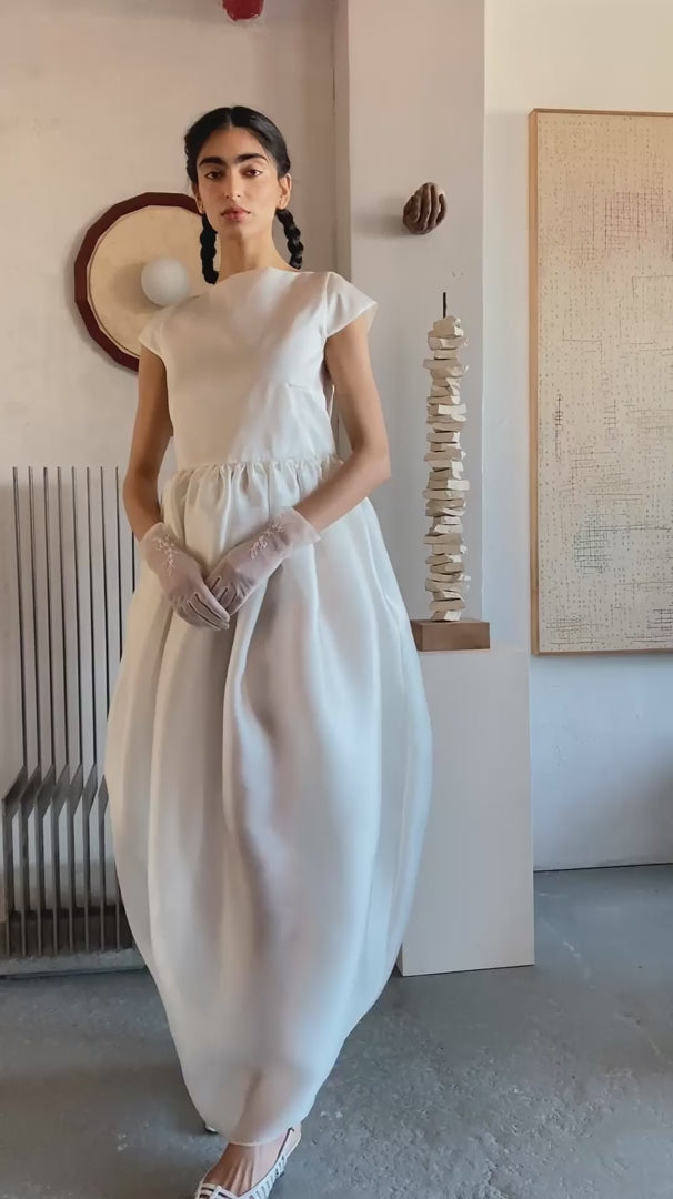 This floor-length dress is cut in satin-finished silk organza, a fabric that holds volume while remaining impossibly light. The silhouette floats around the body with quiet drama: the skirt is both sculptural and flowy, like a petal mid-bloom. At the back, a heart-shaped opening fastens with delicate silk ties. Poetic, weightless, and made to move.