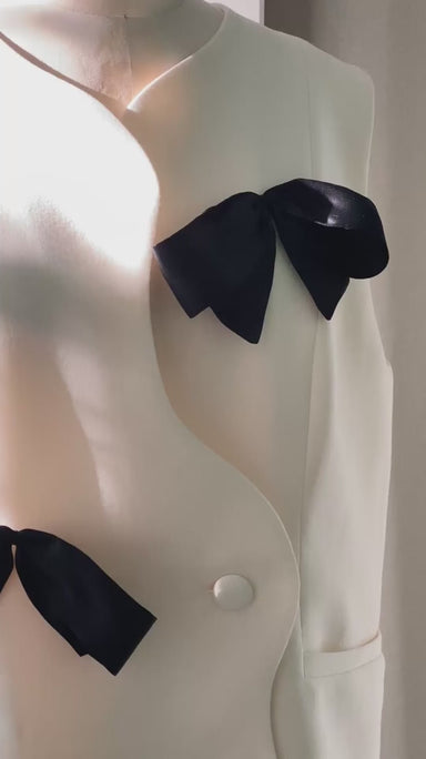 This sleeveless, double-breasted vest is smartly tailored from wool crepe, featuring a wavy front and three lustrous decorative silk bows—a hand-fi...