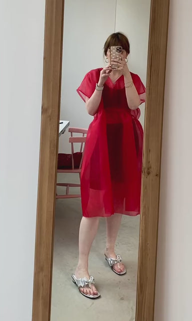 Elegant dress featuring a boxy relax silhouette. The sleeves are made from silk organza, while the flowing skirt and bodice are woven from crumple ...
