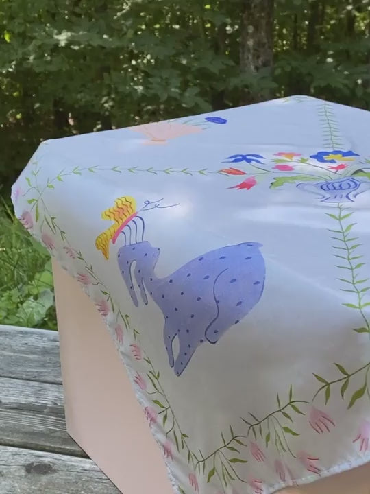 Emblematic quality delicate silk scarf designed with Montreal-based artist Estée Preda. The print pays an hommage to folk art and the needlework of our grandmothers. Spring quickly crept into the conversation between Estée and me, vines bloomed and butterflies hatched. The brightest colors prevailed, and the cut flowers were carefully arranged in bouquets. Sent to you lovingly hand wrapped.