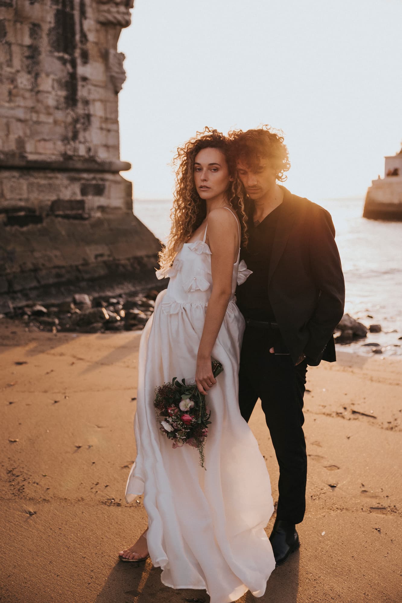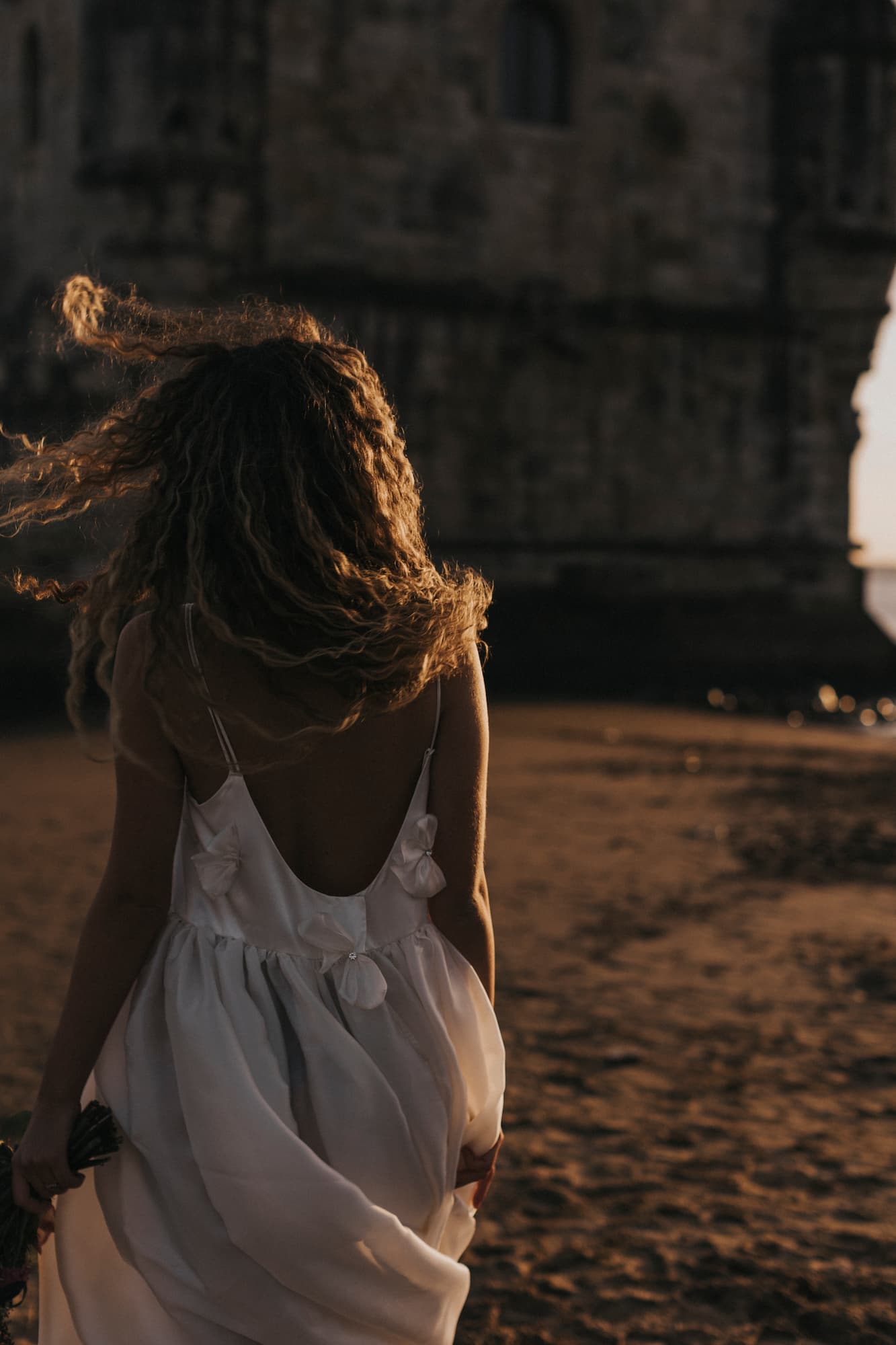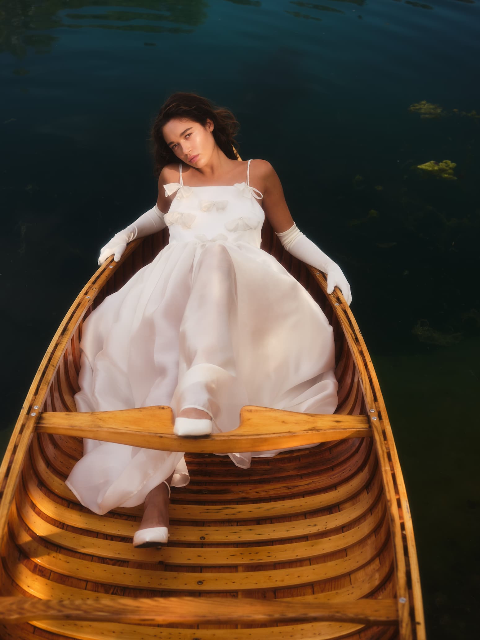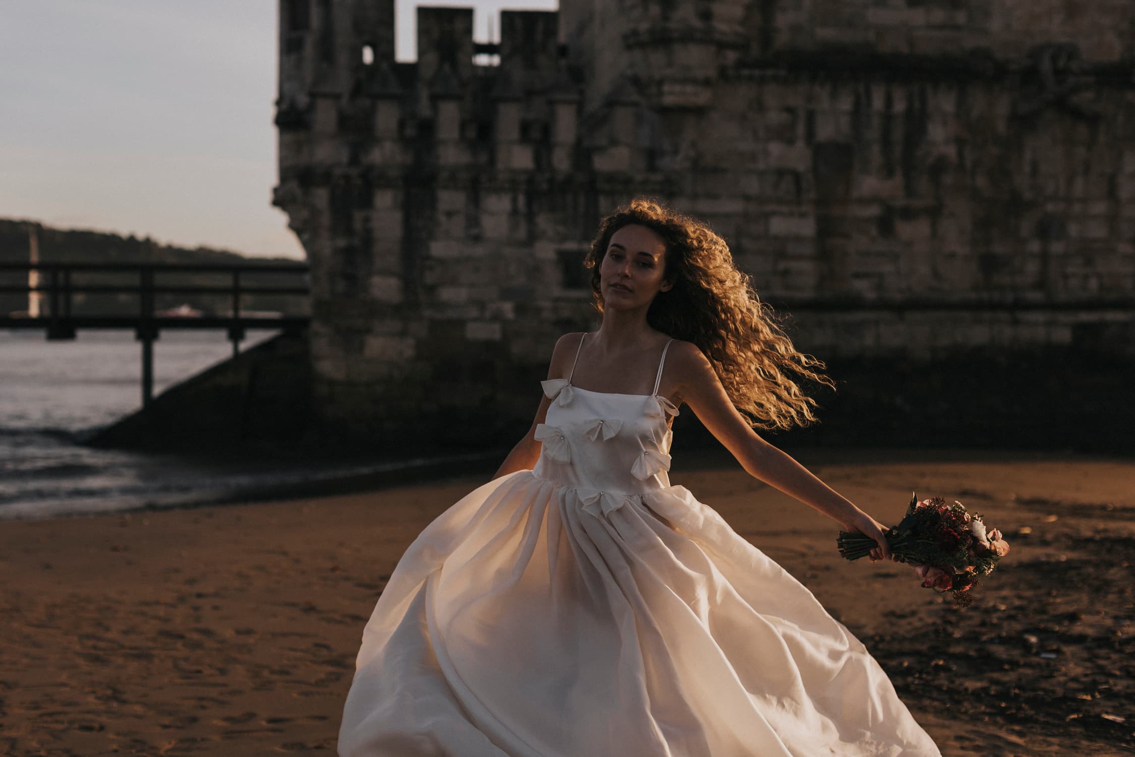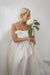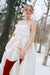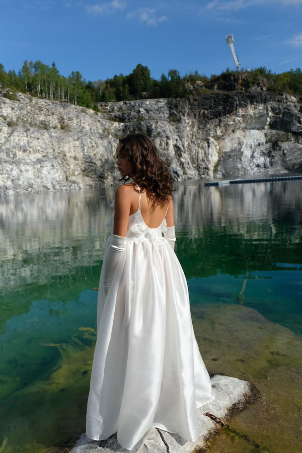 Cette longue robe majestueuse en soie est à la fois volumineuse et légère comme l’air. Avec ses boucles au buste surmontées de strass, elle a un je-ne-sais-quoi d’une princesse moderne.