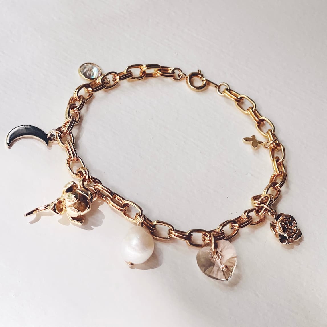 - Chunky chain with roses and heart charms (tarnish resistant highly polished gold-plating)